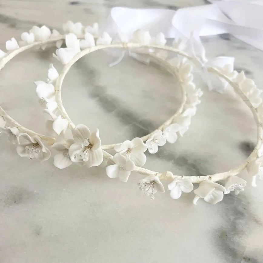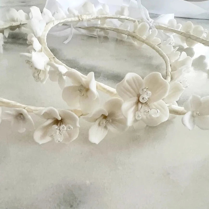 Delicate Stefana wedding crowns crafted with handmade porcelain flowers (1-2cm). Designed with a modern twist on traditional Stefana.